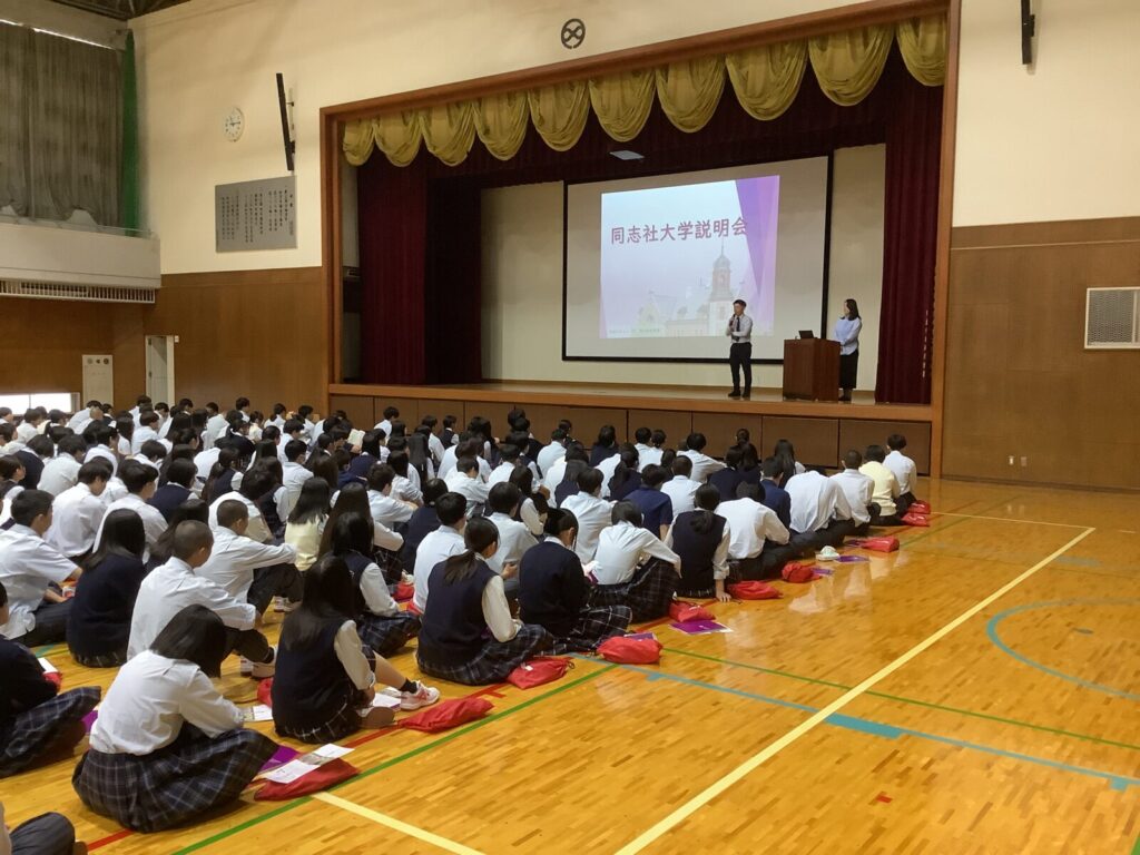 9月30日(火)考査終了後に、同志社大学・入学センター入学課入学広報係の黒田とき様をお招きし、本校向けの入試説明会を校内で実施しました。当日は、最新の入試制度や同志社大学の魅力などについて、丁寧にご説明いただきました。このような機会を通じて、生徒一人ひとりが将来の進路について主体的に考えるきっかけとなることを期待しています。今後も、大学との連携を深めながら、生徒の進路選択を支援してまいります。