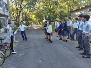 K特進コース1,2年生を対象に「進路を考える1日」として、10月10日(金)の午後に京都府立大学キャンパス見学ツアーを実施しました。当日は、社会科学部(現公共政策学部)公共政策学科 教授 学長特別補佐の窪田教授による大学紹介や学科案内、そして本校卒業生(生命理工情報学部生命化学科2回生)である木村里穂さんによる大学構内の見学など丁寧に対応していただきました。このような機会を通じて、生徒一人ひとりが将来の進路について選択の幅を広げ、主体的に考え行動できるようになることを期待しています。今後も、大学との連携を深めながら、生徒の進路選択を支援してまいります。